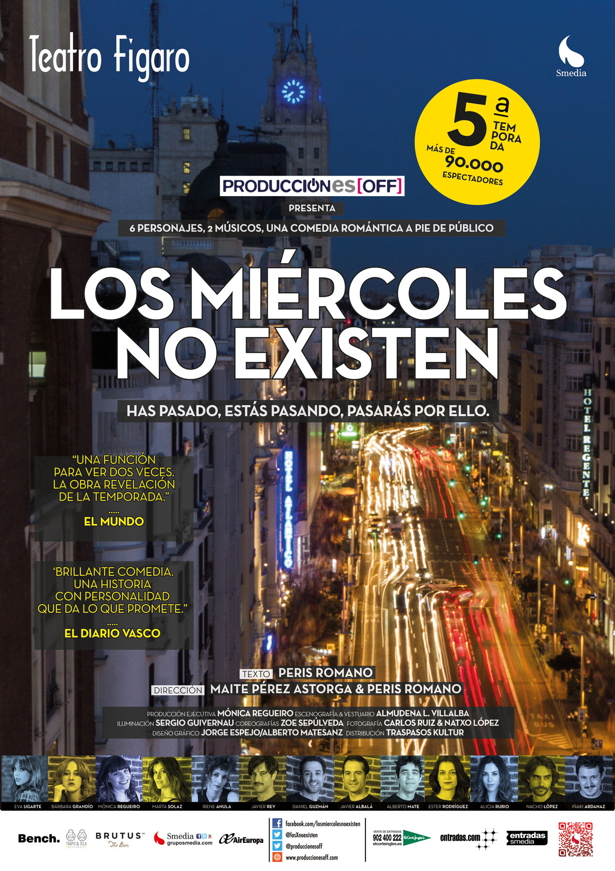 Los miércoles no existen es una dramedia romántica sobre las relaciones de amor y amistad que han conseguido crear un retrato generacional que ha sorprendido y enamorado a casi 1000.000 personas. Una hazaña de la que pocas funciones pueden hacer gala… Más de tres años en cartel con entradas agotadas, una gira con un éxito arrollador y cinco temporadas.